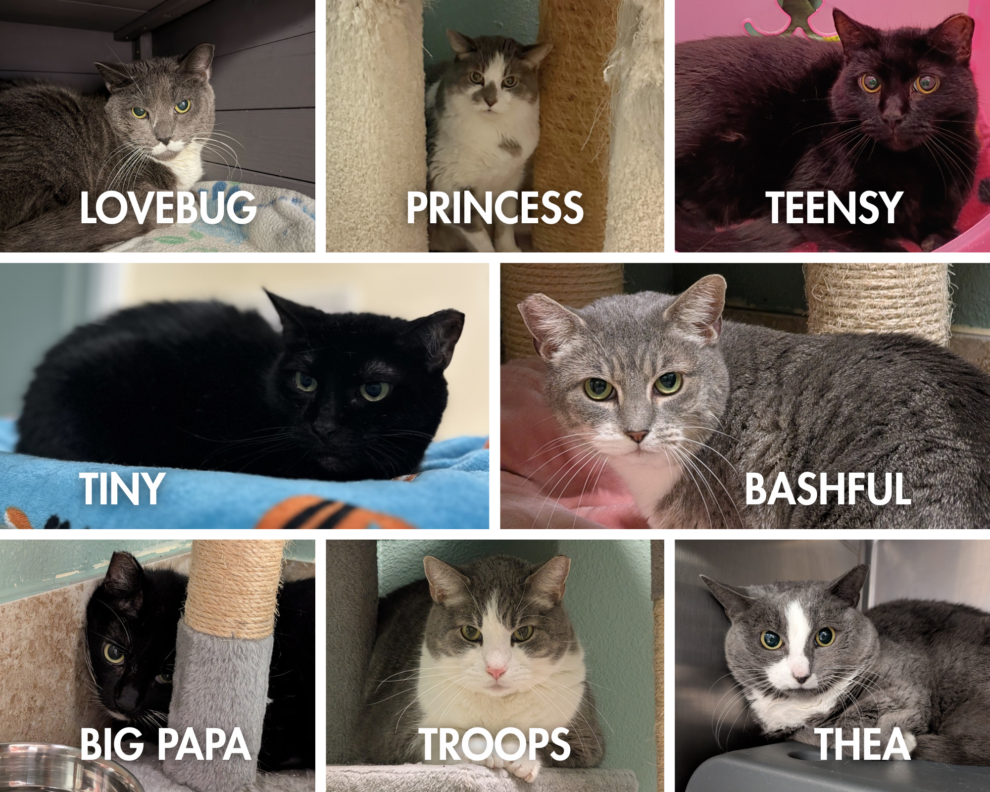 Meet our longest cat residents: Lovebug, Princess, Teensy, Tiny, Bashful, Big Papa, Troops, and Thea! At the start of the new year, we welcomed these 12-year-old senior cats who needed a soft place to land after their owner went into hospice care. These seniors have been through a lot of change to start the year and have been struggling with shelter life. They need patient, loving homes where they can feel safe and have time to open up to their new families. They all came from the same home and would likely adjust more easily with another feline companion by their side. If you have an open spot on your couch and room in your heart, please consider helping one of these cats spend their golden years surrounded by comfort, kindness, and love! You can meet these seniors at our Adoption Center in Titusville.